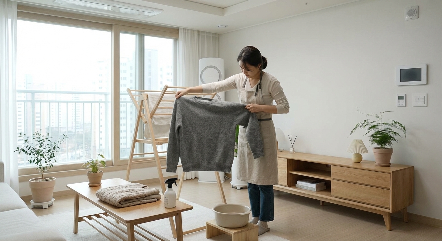 세제 선택도 중요합니다. 30년 경력 세탁나눔방 안형 대표는 캐시미어나 울 같은 동물성 섬유에 과탄산소다나 효소 성분이 든 세제를 절대 쓰지 말라고 당부합니다. 강한 알칼리성 세제는 원단 단백질 조직을 파괴합니다. 중성세제인 울샴푸를 미지근한 물에 완전히 녹인 뒤 옷을 넣고, 비비지 말고 부드럽게 눌러가며 세탁합니다.